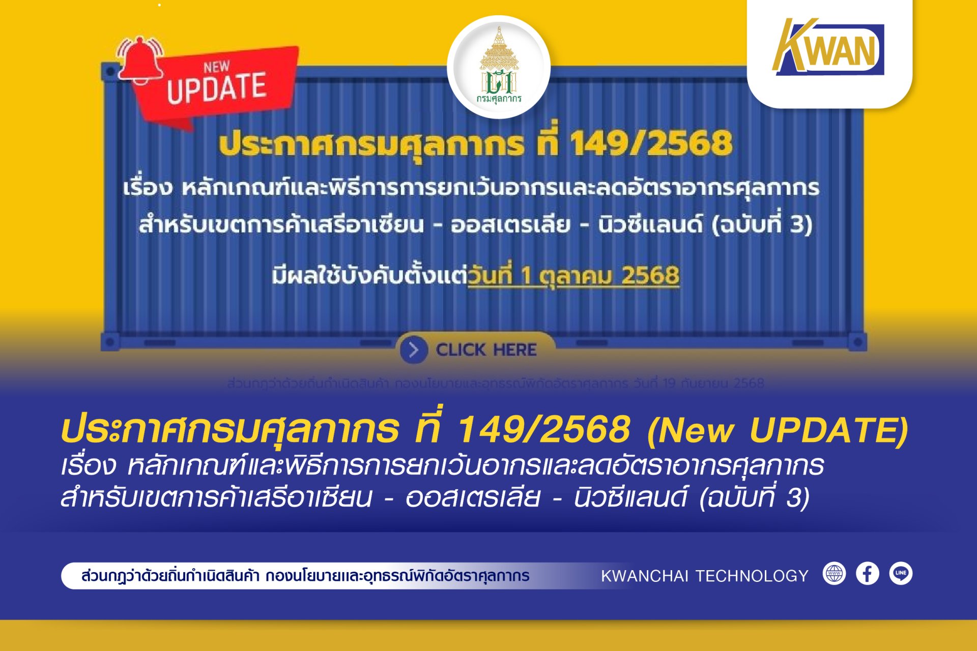 ประกาศกรมศุลกากร ที่ 149/2568 เรื่อง หลักเกณฑ์และพิธีการการยกเว้นอากรและลดอัตราอากรศุลกากร