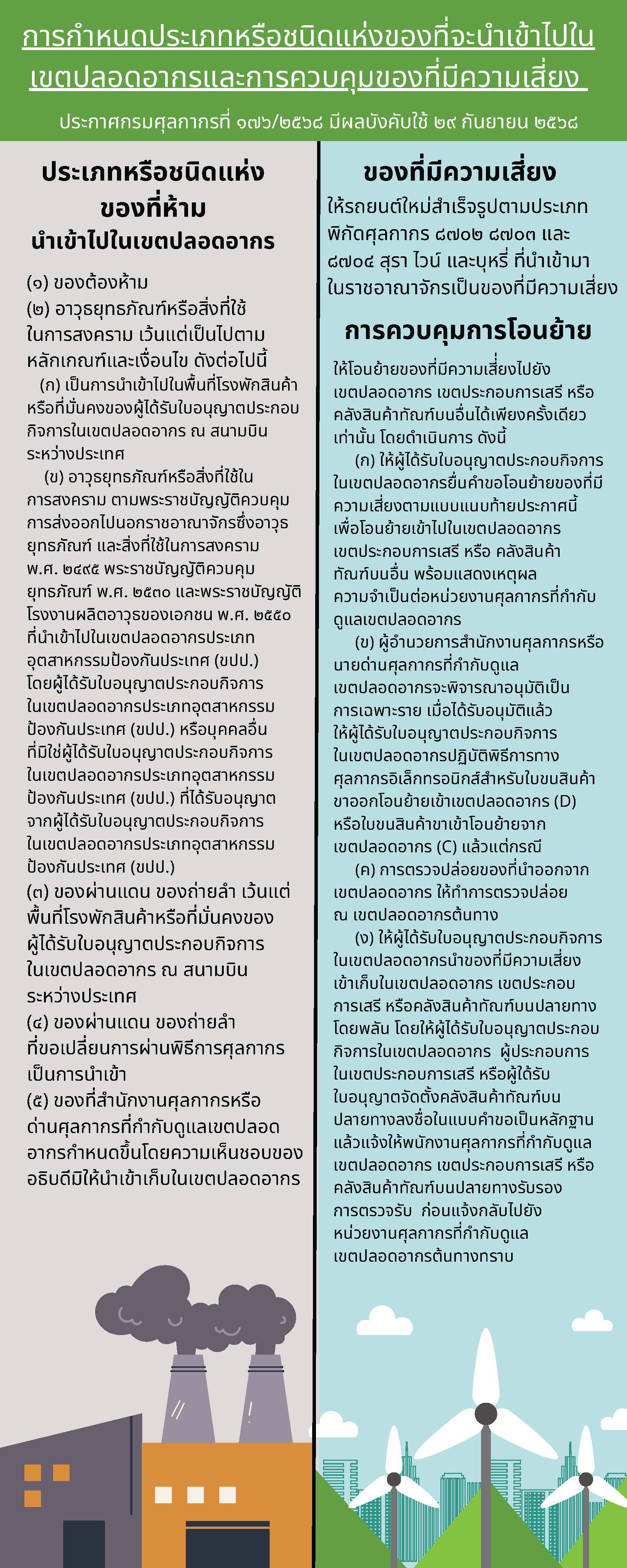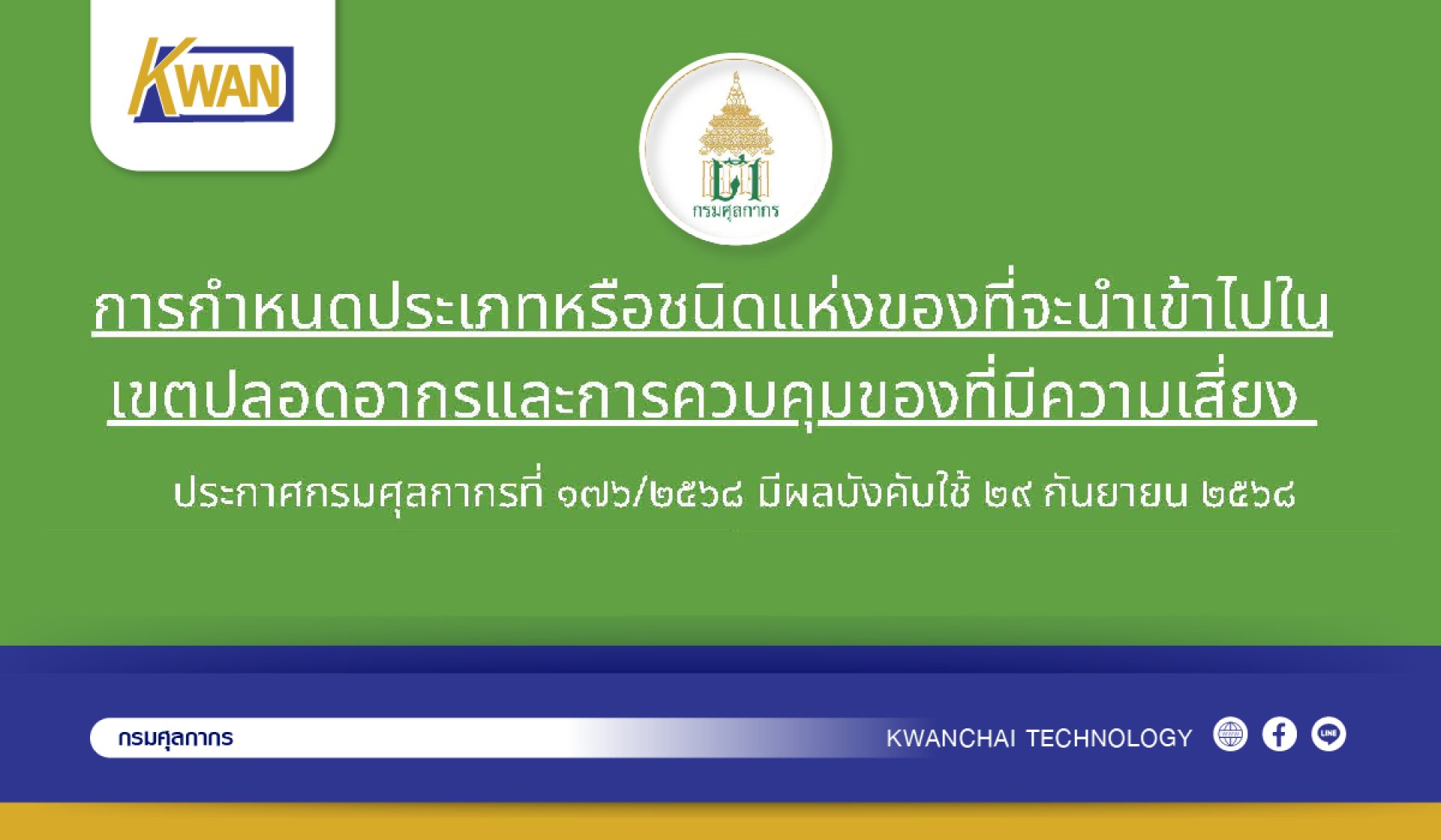 ประกาศกรมศุลกากร ที่ 176/2568 เรื่อง การกำหนดประเภทหรือชนิดแห่งของที่จะนำเข้าไปในเขตปลอดอากรและการควบคุมของที่มีความเสี่ยง