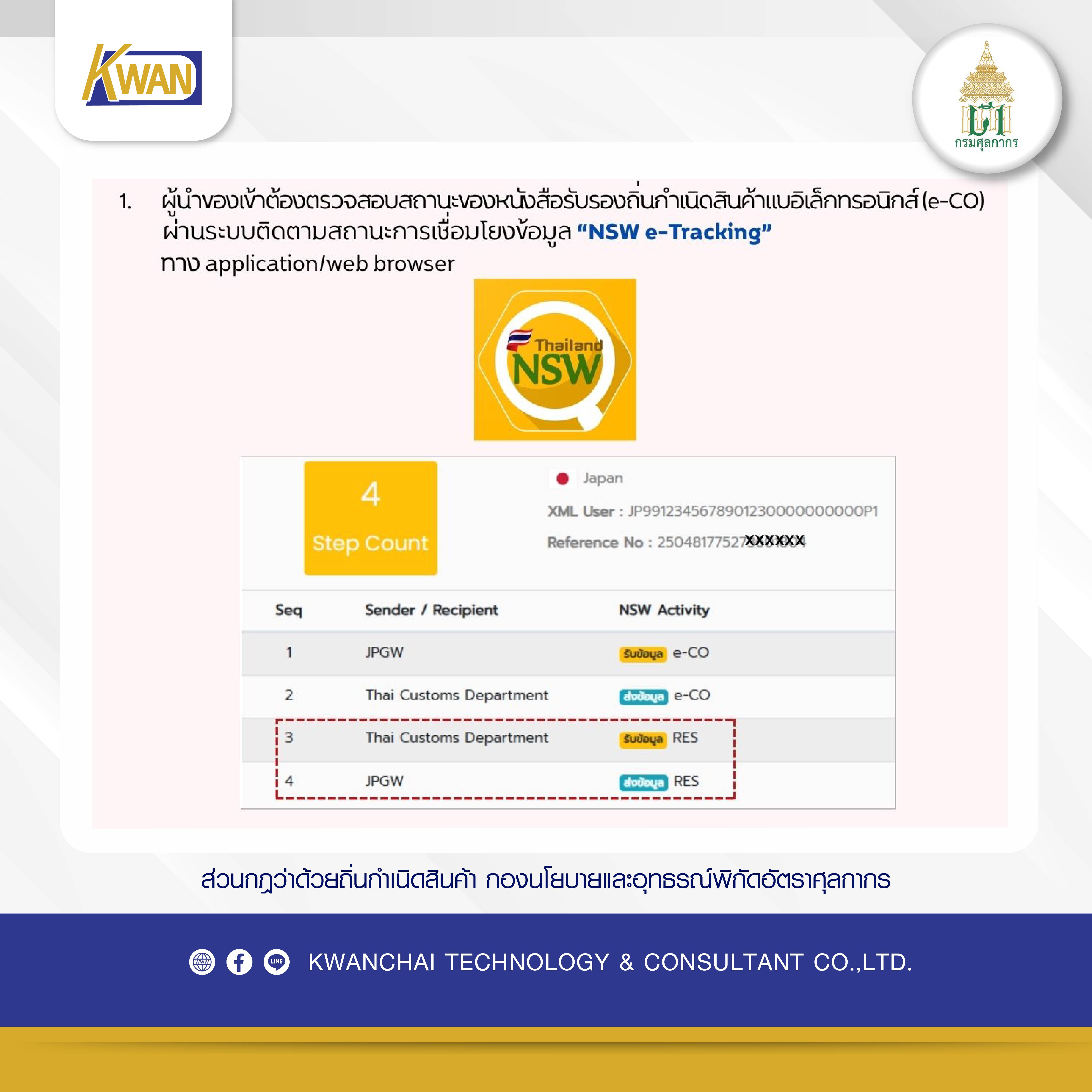 - ผู้นําของเข้าต้องตรวจสอบสถานะของหนังสือรับรองถิ่นกําเนิดสินค้าแบบอิเล็กทรอนิกส์ (e-CO) ผ่านระบบติดตามสถานะการเชื่อมโยงข้อมูล NSW e-Tracking" ทาง application/web browser