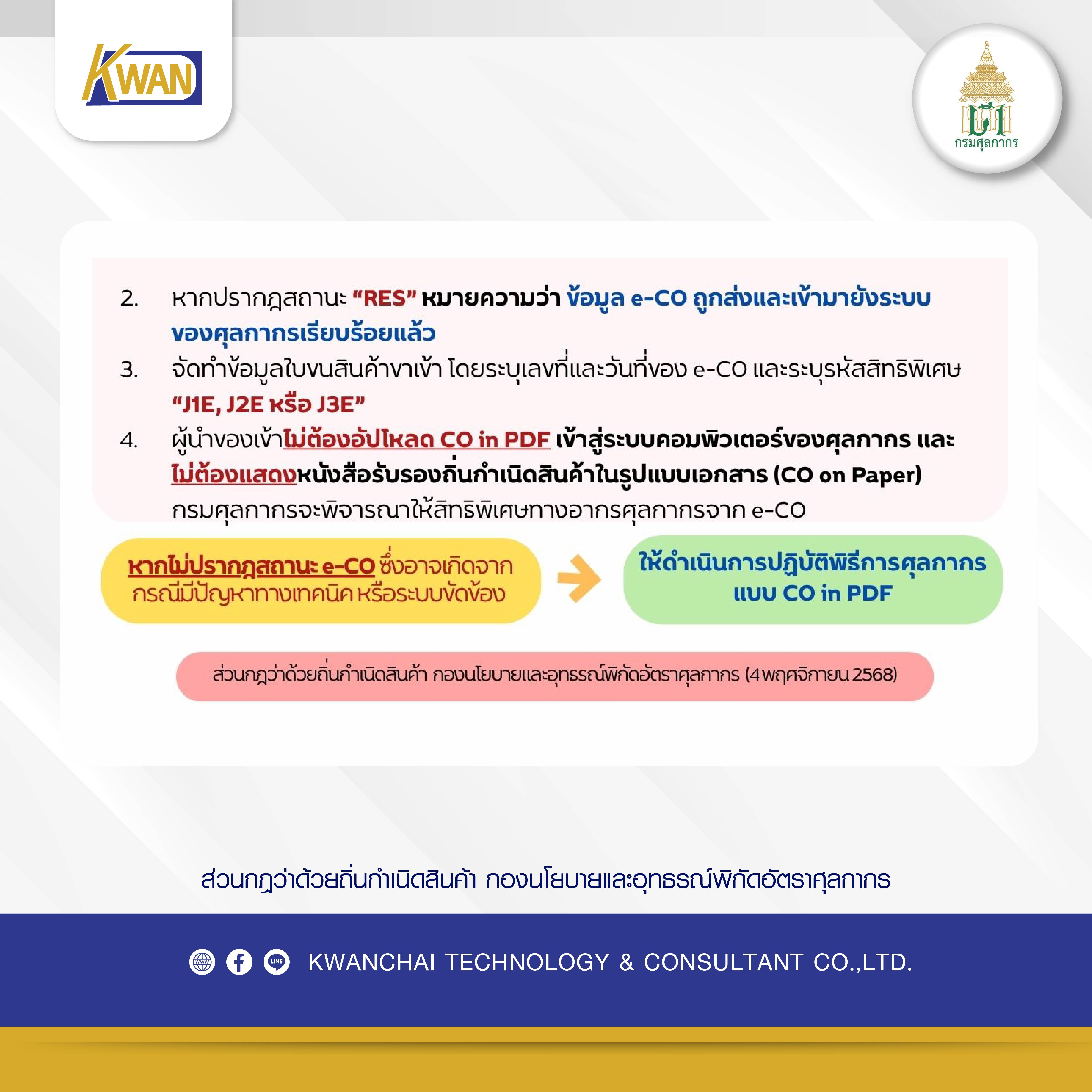 - ผู้นําของเข้าไม่ต้องอัปโหลด CO in PDF เข้าสู่ระบบคอมพิวเตอร์ของศุลกากร และ ไม่ต้องแสดงหนังสือรับรองถิ่นกําเนิดสินค้าในรูปแบบเอกสาร (Co on Paper) กรมศุลกากรจะพิจารณาให้สิทธิพิเศษทางอากรศุลกากรจาก e-Co