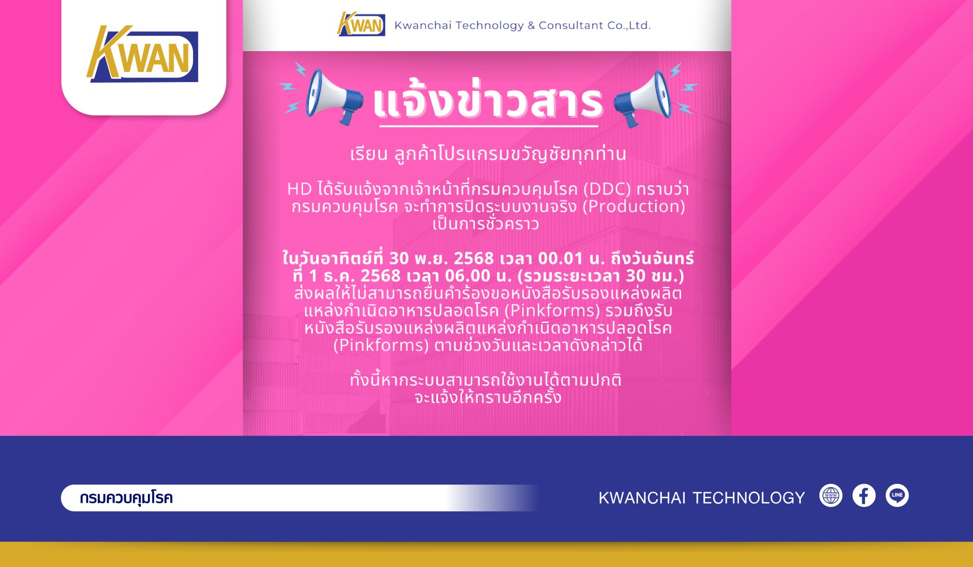 HD ได้รับแจ้งจากเจ้าหน้าที่กรมควบคุมโรค (DDC) ทราบว่า กรมควบคุมโรค จะทำการปิดระบบงานจริง (Production) เป็นการชั่วคราว
