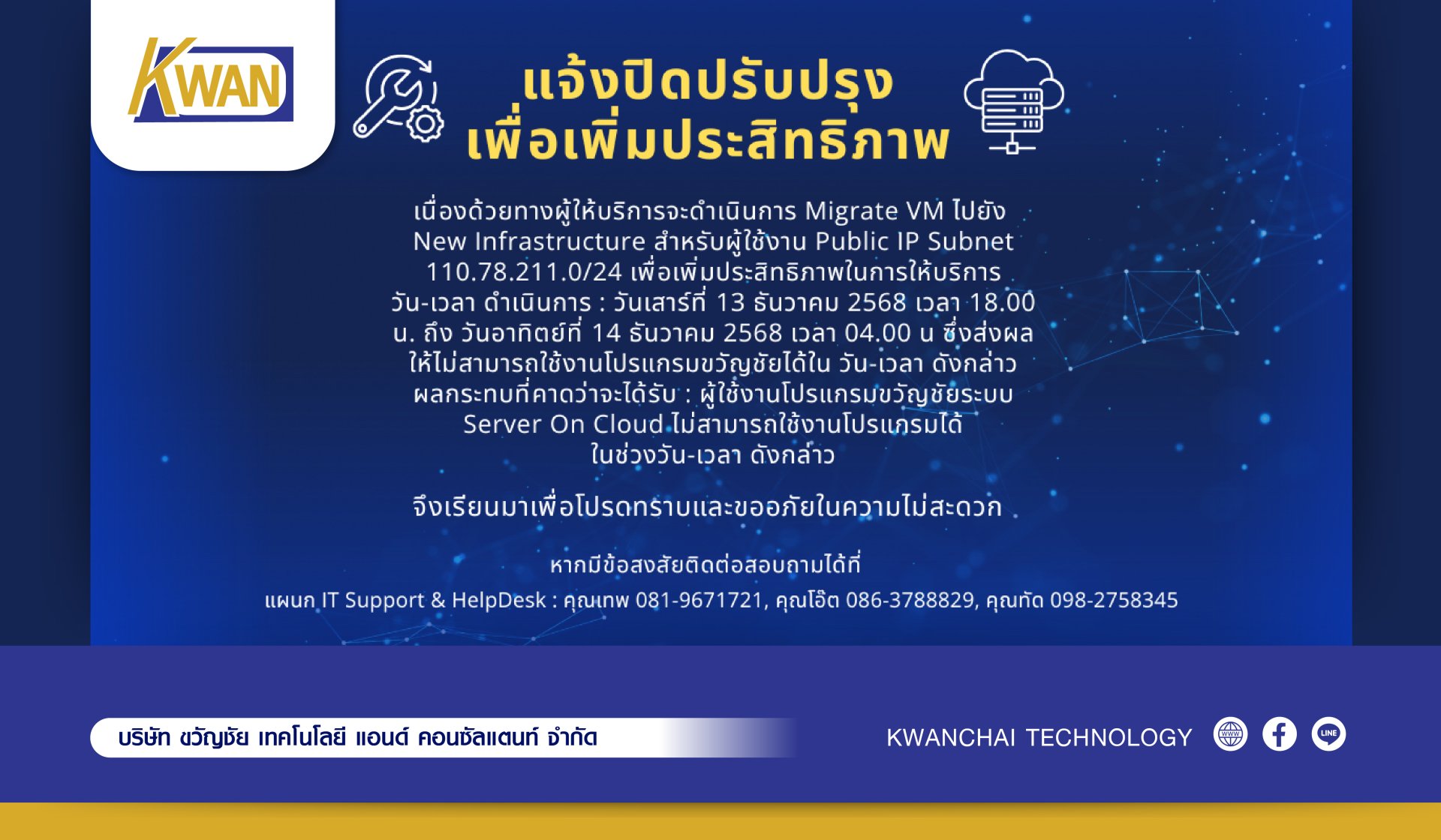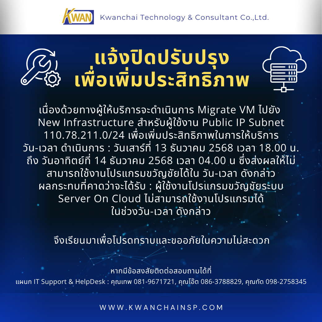 แจ้งปิดปรับปรุงเพื่อเพิ่มประสิทธิภาพ โปรแกรมขวัญชัยระบบ Server On Cloud