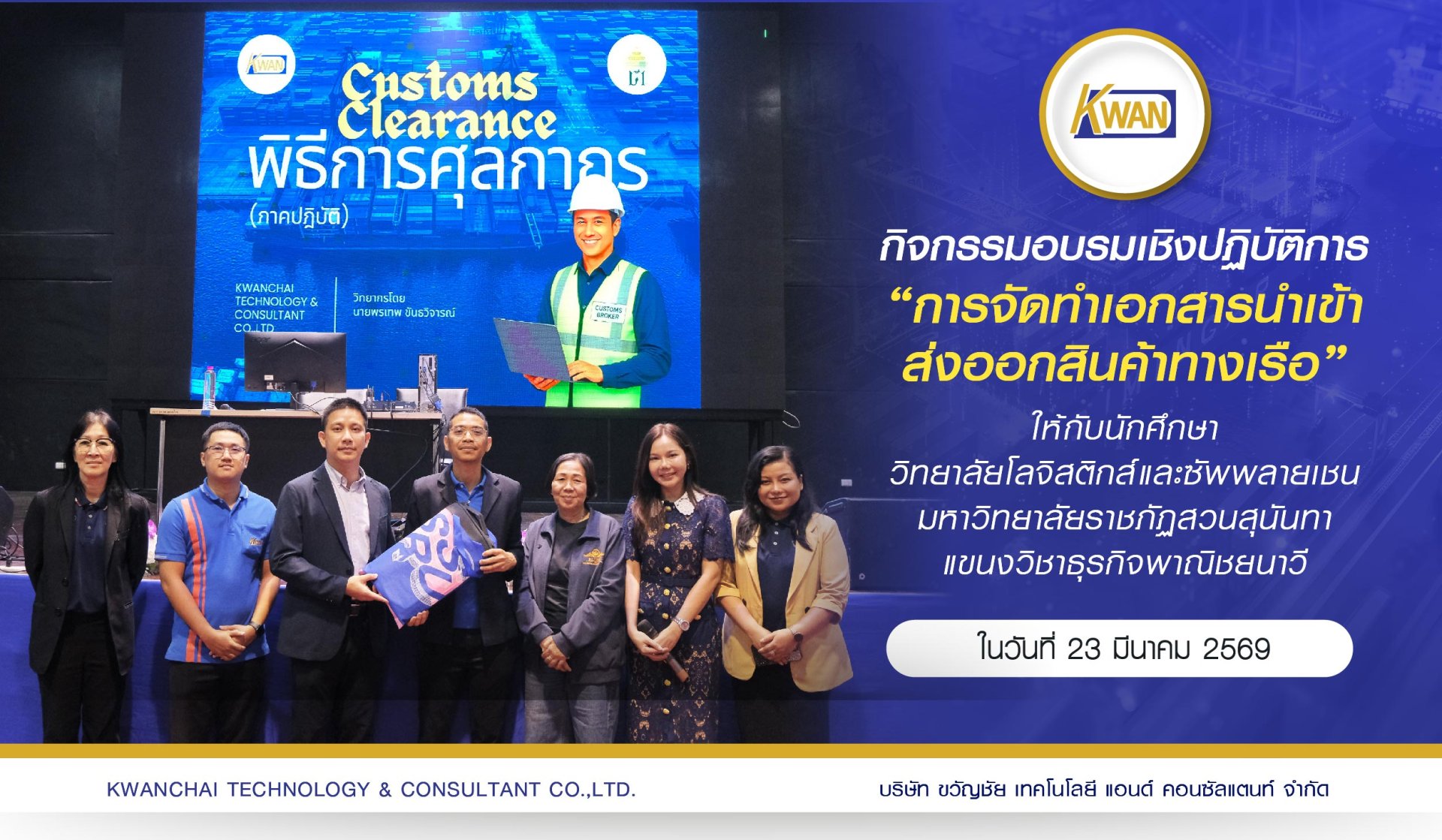 วันจันทร์ที่ 23 มีนาคม 2569 ทางบริษัท ขวัญชัย เทคโนโลยี แอนด์ คอนซัลแตนท์ จำกัด ได้รับเกียรติจาก ดร.ลำไผ่ ตระกูลสันติ (รองคณบดีฝ่ายวิชาการ) อาจารย์ศิริอร สนองค์ (หัวหน้าแขนงวิชาธุรกิจพาณิชยนาวี) พร้อมด้วยคณาจารย์ประจำสาขา วิทยาลัยโลจิสติกส์และซัพพลายเชน มหาวิทยาลัยราชภัฏสวนสุนันทา โดยแขนงวิชาธุรกิจพาณิชยนาวี